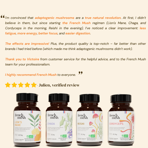 French Mush uses extracts. This is dried powder of mushrooms which are then extracted. In fact, the interesting active ingredients of mushrooms cannot be bioavailable in the human body without first extraction. For information, 300 grams of dried powder are necessary to make 30 grams of extracts. French Mush products are therefore very concentrated and among the most effective in Europe.